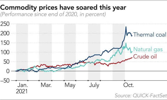 Tháng 9 vừa qua, thế giới đã chứng kiến một đợt tăng giá nhiên liệu với giá dầu tăng cao nhất sau 3 năm đổ lại. Giá khí tự nhiên giao dịch trong tháng 10 đã tăng chưa từng thấy trong 7 năm gần đây. Chỉ số giao ngay hàng hóa (CSI) của Bloomberg đã lên cao nhất trong 1 thập kỷ.