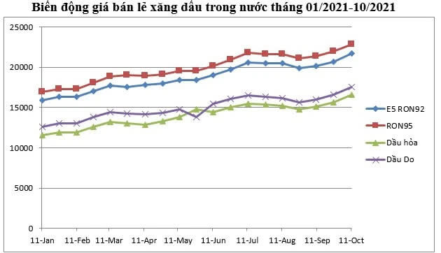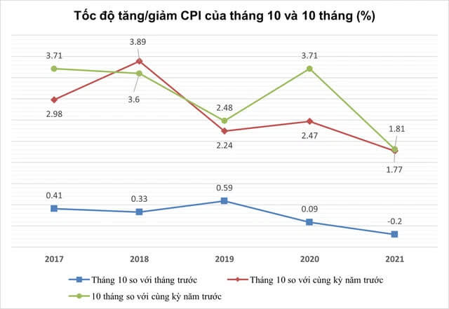 Tính chung 10 tháng năm 2021, CPI tăng 1,81% so với cùng kỳ năm trước, mức tăng thấp nhất kể từ năm 2016. Lạm phát cơ bản 10 tháng tăng 0,84%.